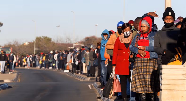 Commuters line up on Monday as they wait for the bus during a protest by taxi operators over the government’s financial relief for the taxi industry, in Soweto, South Africa [File: Siphiwe Sibeko/Reuters]